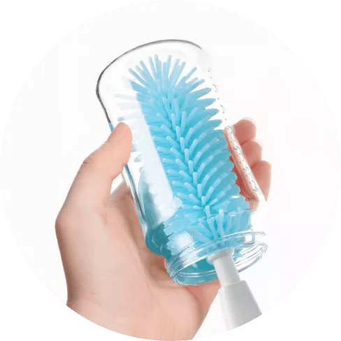 Baby bottle brush for cleaning bottle body and cap. There’s also a hidden nylon nipple brush sponge, designed specifically to clean valves, handles, bottle straws, sippy cups and more. Wash thoroughly before initial use and periodically. Handwash in warm water. Rinse thoroughly and air dry.