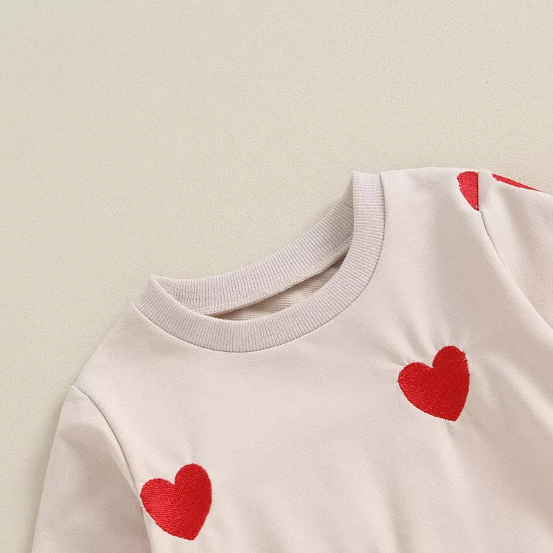Adorable Heart Embroidery: The centerpiece of this outfit is the exquisite heart embroidery on the sweatshirt, adding a playful and loving touch.