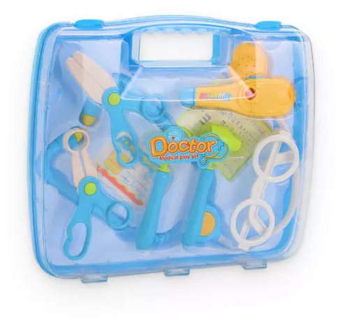 The kit contains a simulation dental mirror, scissors, thermometer, stethoscope, otoscope, Snellen chart, and work permit card. Different specializations!